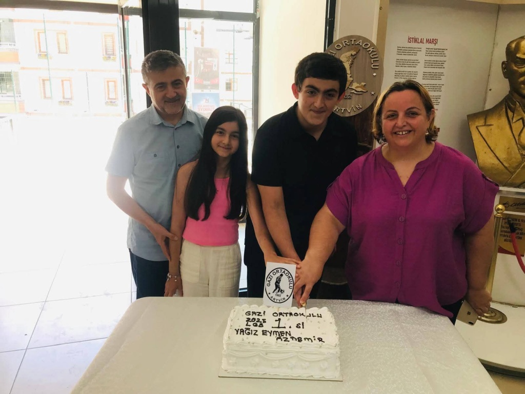 2024-2025 Yıl sonu Gazi Ortaokulu LGS Artvin Merkez ve Okul Birincisi Yağız Eymen ÖZDEMİR Okul Mezuniyet Kütüğüne ismini yapıştırdı ve Belgesini verdik.Öğrencimize pasta kestirdik.